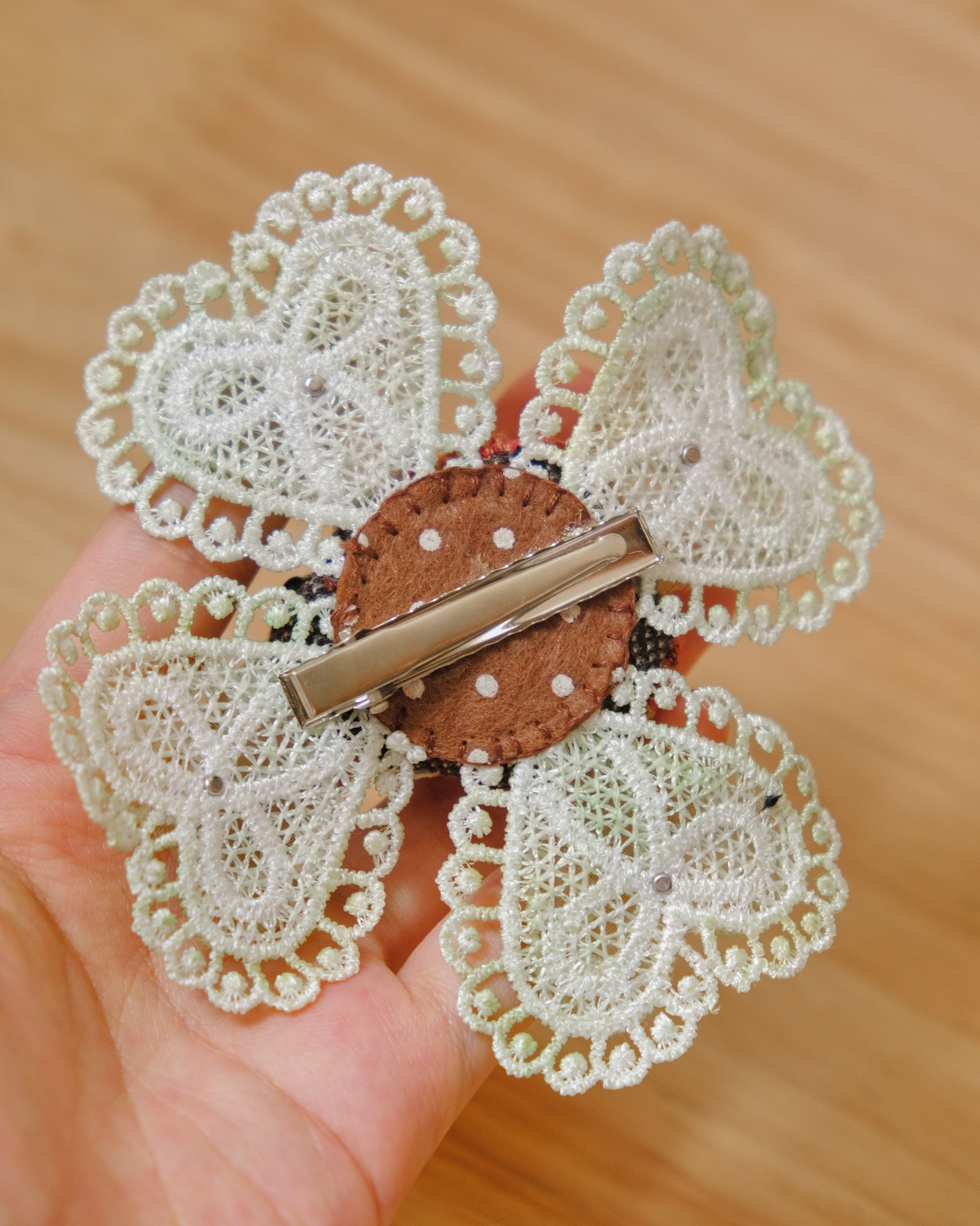 Finished with delicate lace trimming and a fabric ladybug detail. The ladybug is attached with a removable brooch backing, allowing you to detach it before washing.
